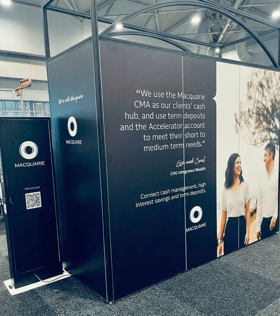 Large-format and environmental applications showing how the Macquarie brand scaled across event, exhibition, and experiential touchpoints.