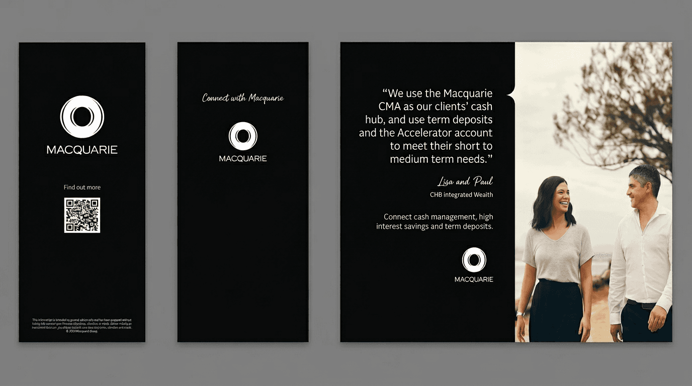 At Macquarie, I worked on extending the brand across a range of communication and experience touchpoints, translating core visual principles into scalable systems that could flex across event environments, branded communications, digital campaigns, and physical spaces. The work focused on creating consistency without rigidity, allowing the brand to feel recognisable, premium, and adaptable across very different contexts.