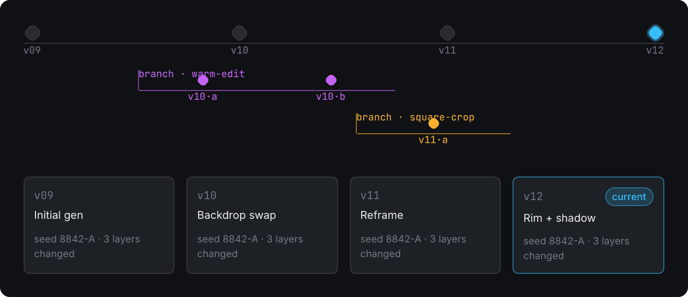 Branch from here on any node. The branch inherits the parent's layers and provenance, then diverges. Branches compare side-by-side and merge at the layer level — never the pixel level.