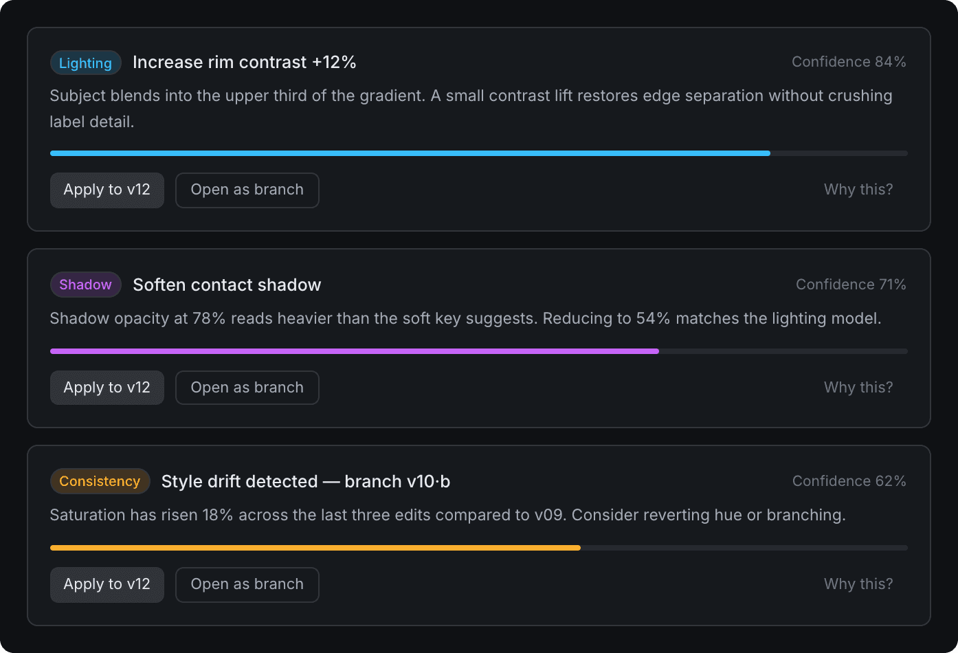 Suggestions are scoped. Each one targets a specific layer and a specific dimension (lighting, contrast, consistency). No "make it better" pseudo-magic.