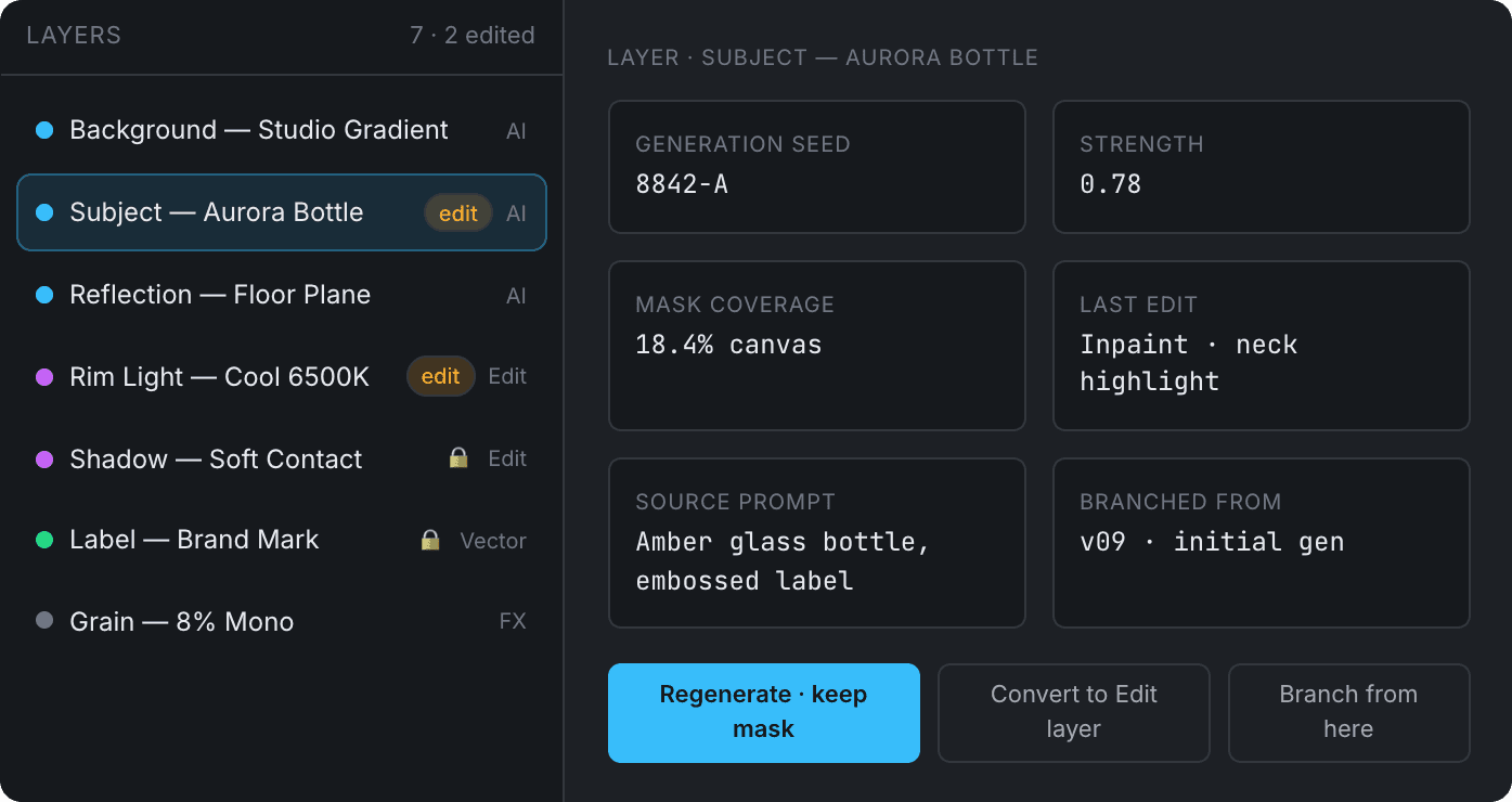 Each AI layer carries its full provenance: the prompt that made it, the seed, the mask, and which version of the canvas it belongs to. "Regenerate" is a scoped operation, not a reset.