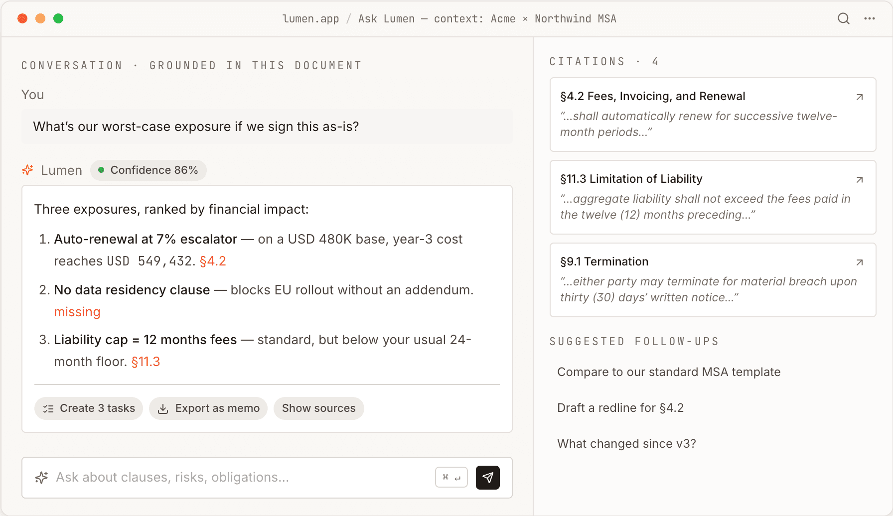 Authoring, not just reading. Lumen consumes documents. The harder, more valuable problem is generating them — drafting clauses that inherit organizational memory.