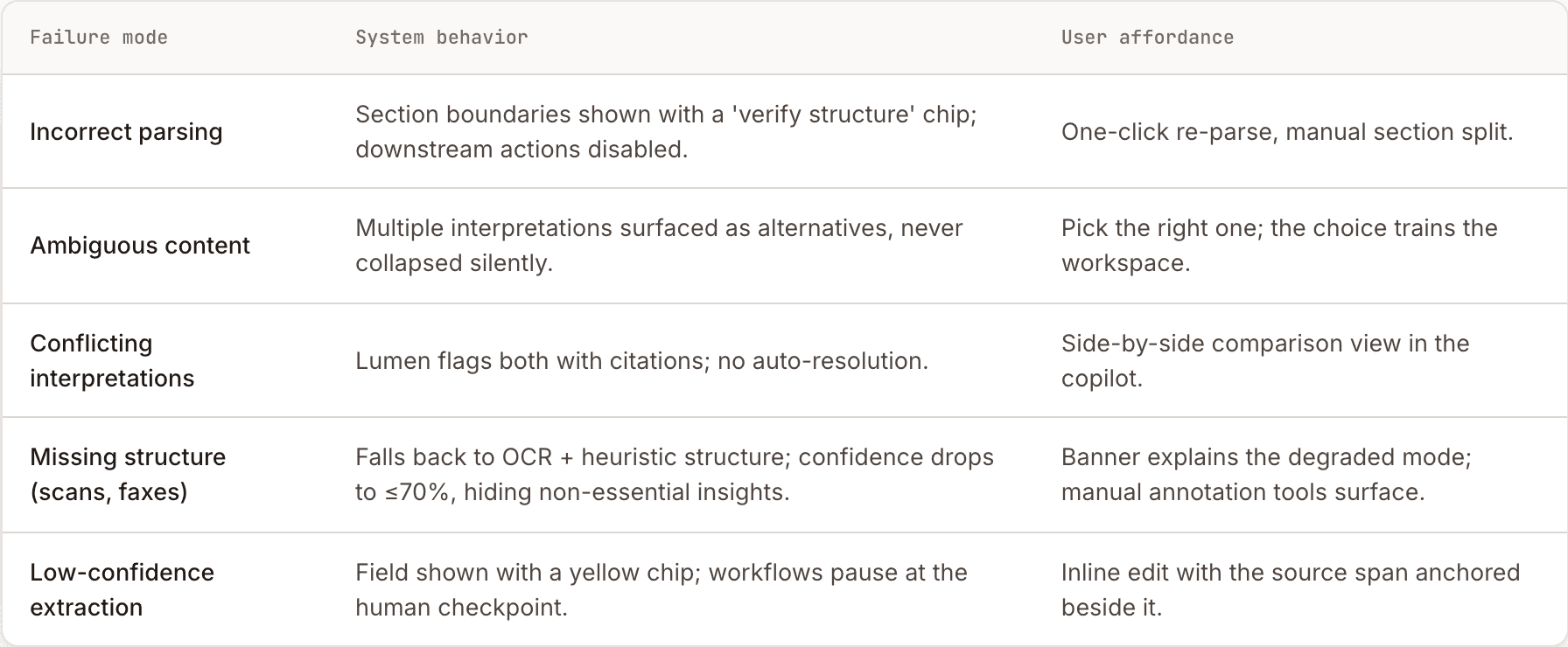 Workflows halt at the confidence threshold. The product's reliability comes from predictable failure, not optimistic success.