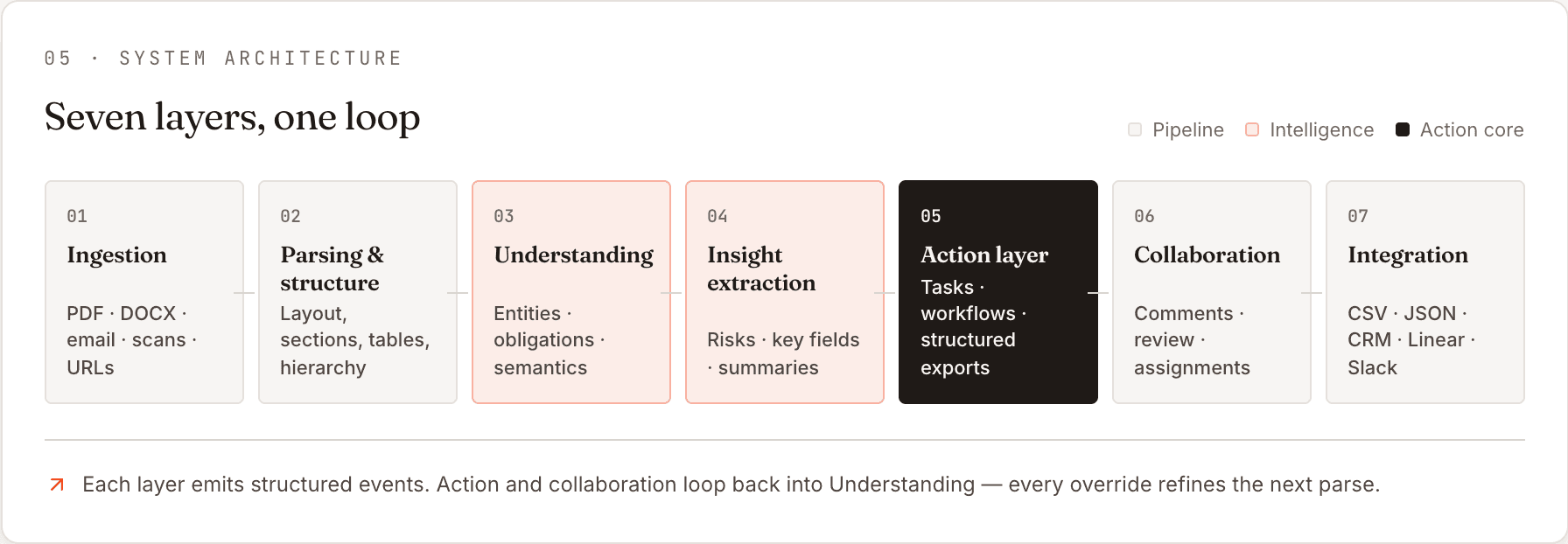 Every action feeds back into Understanding. Next document of the same shape, the system proposes the workflow it watched you build.