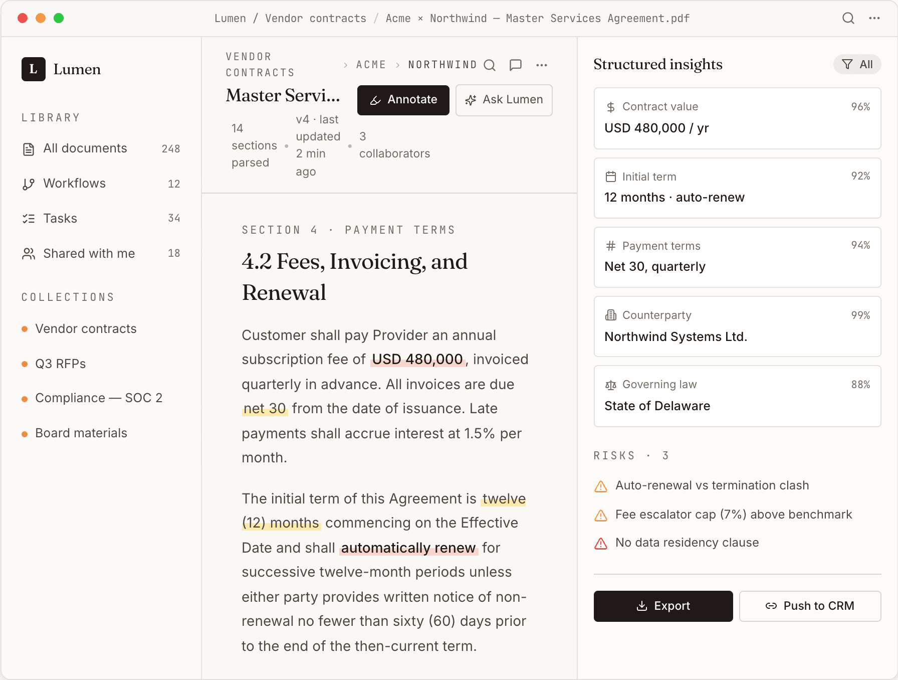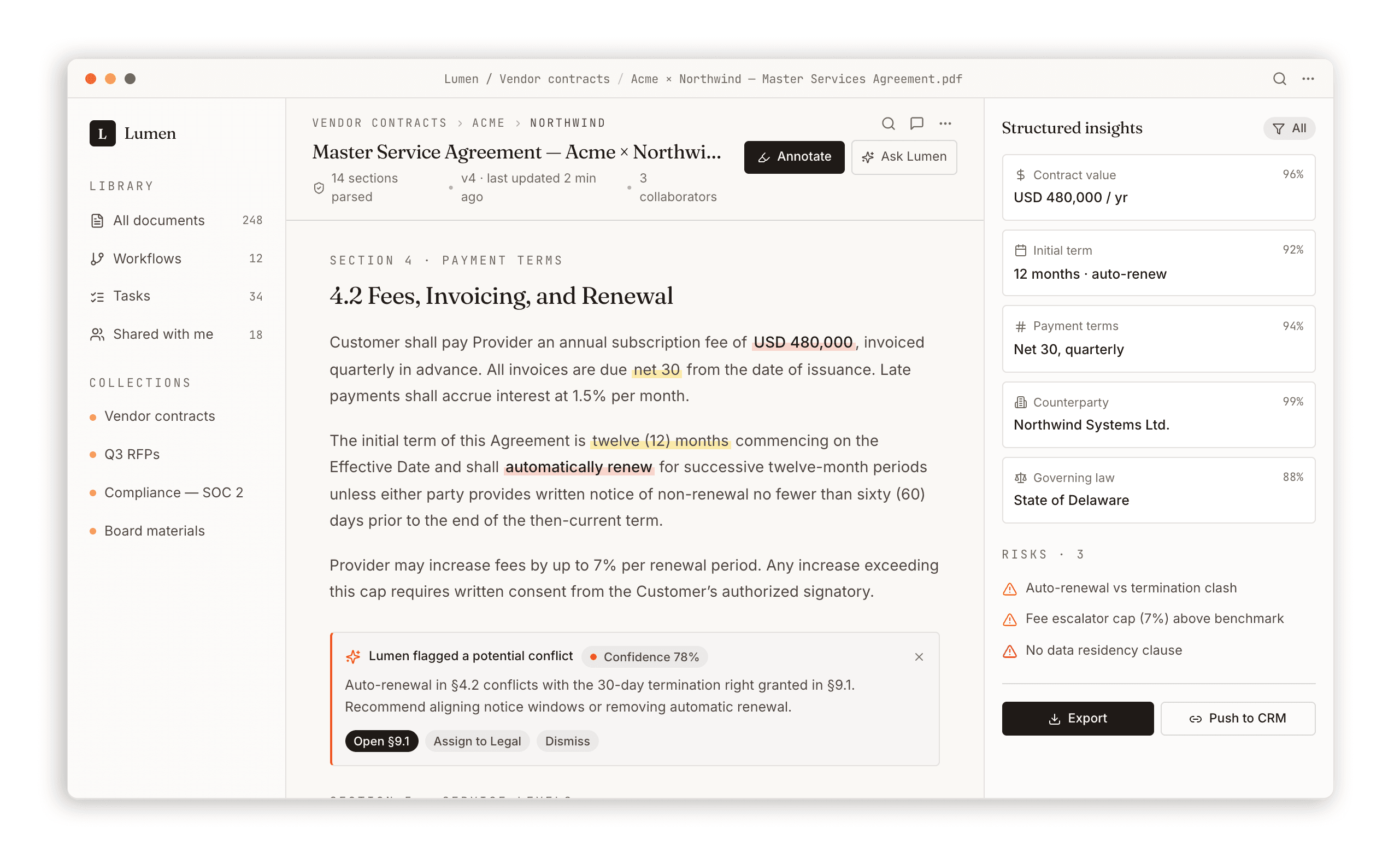 Lumen's shift: Document → addressable system. Every clause has an ID. Every entity is typed. Every action assign, extract, escalate, export attaches to a specific span and survives the document's lifecycle.