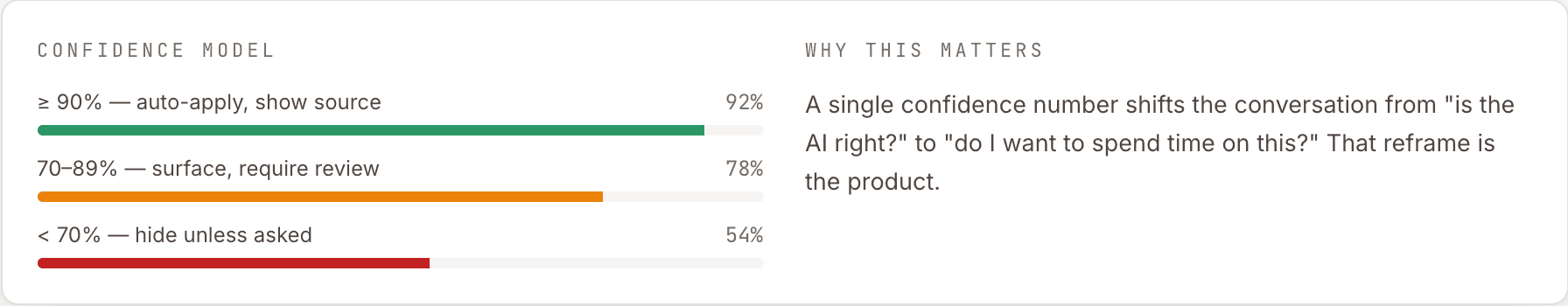 No field is auto-applied and no workflow runs unattended below 90% confidence. Full automation demos better and ships worse — it manufactures distrust the moment it's wrong once.