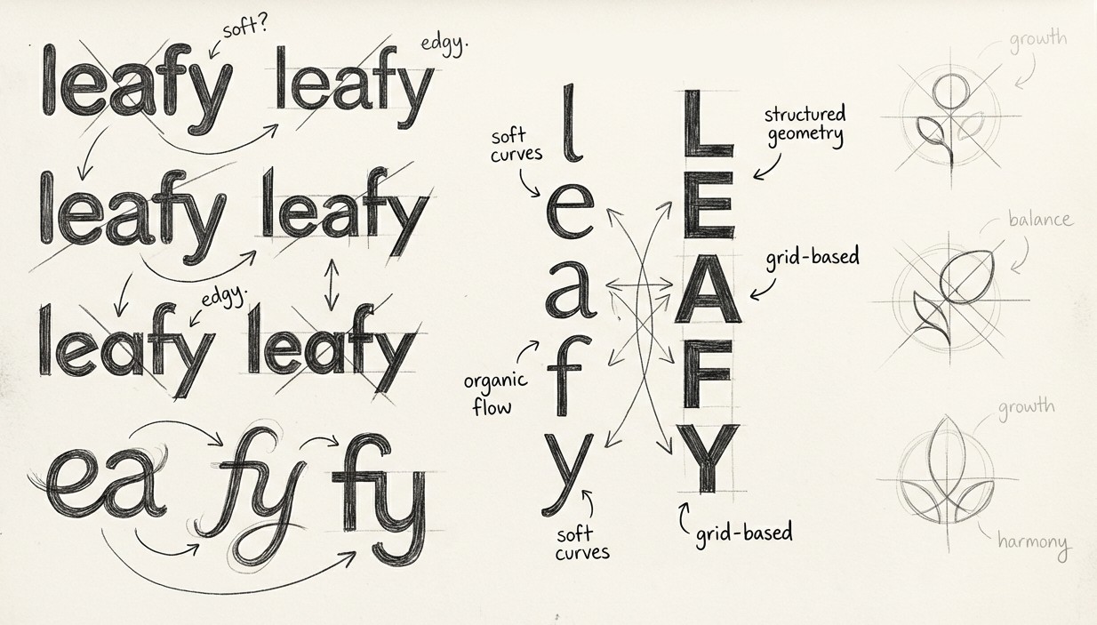 The final Leafy logo is built on a clear geometric grid with consistent curves and controlled negative space. This was intentional.